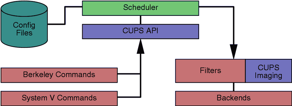 Like most printing systems, CUPS is designed around a central print scheduling process that dispatches print jobs, processes administrative commands, provides printer status information to local and remote programs, and informs users as needed. Figure 1 shows the basic organization of CUPS.