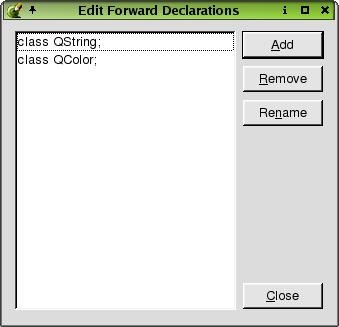 To add a new declaration, click the Add button. A line edit will appear for you to type the declaration. Press Enter after you have typed the declaration. To delete a declaration from the listbox, click the declaration and then click Remove. To rename an existing declaration, click the declaration and then click Rename. The cursor will appear in the line edit, allowing you to change the name.