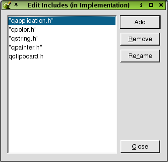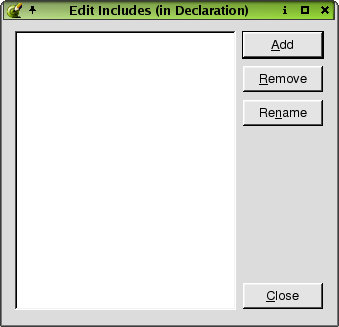 To add a new include, click the Add button. A line edit will appear for you to type the include. Press Enter after you have typed the include. To delete an include from the listbox, click the include and then click Remove. To rename an existing include, click the include and then click Rename. The cursor will appear in the line edit, allowing you to change the name.