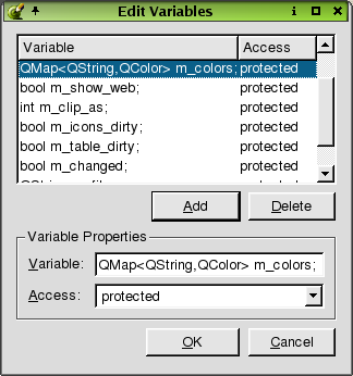 To add a new variable, click the Add button. A line edit will appear for you to type the variable. Press enter after you have typed the variable. To delete an include from the listbox, click the variable and then click Remove. To rename an existing variable, click the variable and then click Rename. The cursor will appear in the line edit, allowing you to change the name.