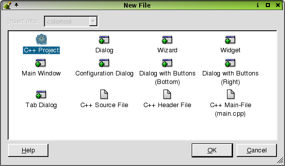 The 'Dialog' file type is highlighted by default when the New File dialog pops up. Click on the file type you want to use and click OK to create it. Click Cancel to leave the dialog without creating a new file. Note that if you select C++ Project, the 'Insert Into' combobox will be disabled, since it is not possible to insert a new C++ Project into an existing project.