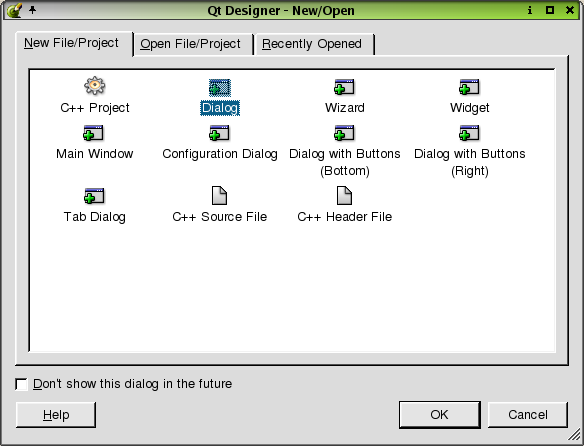 This tab is the default when you start up Qt Designer. Choose to start a new project or to create a file by selecting the appropriate icon from the window. For more information about the different file types available, see the The File Dialogs section.