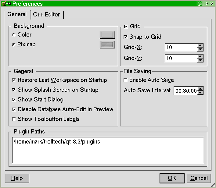 The 'General' tab has sections for Background, Grid, General, File Saving, and Plugin Paths.