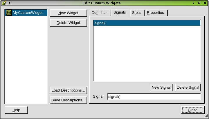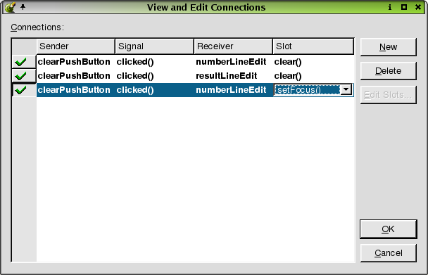 When this dialog is invoked, all existing connections are shown in the listbox. The column headers Sender, Signal, Receiver, and Slot provide details about each connection. Click the column headers to sort the connections. To add a new connection, click the New button. To specify the Sender, Signal, Receiver, and Slot of the connection, click the appropriate fields in the connection and select from the combobox. To delete connections, select the connection(s) and then click the Delete button. To edit custom slots for the current form, choose the form as the Receiver in the currently selected connection and then click the Edit Slots button. This will invoke the Edit Functions dialog.