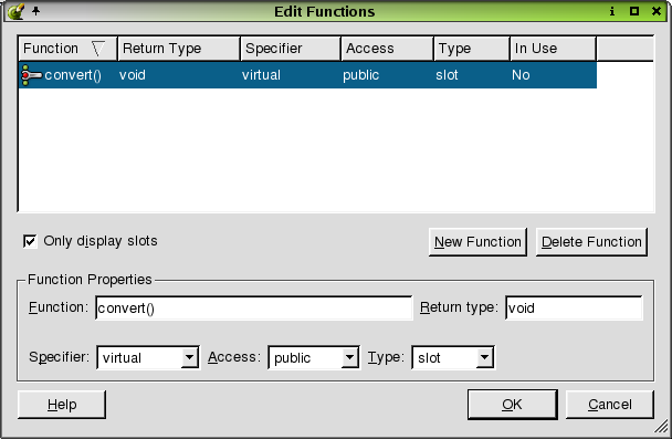 When this dialog is invoked, all existing slots and functions are shown in the listview. The column headers Function, Return Type, Specifier, Access, Type, and In Use provide details about each function that is listed. Click on any of the column headers to sort the functions. To create a new function, click the New Function button. The new function has a default name that you should replace by typing the new name in the 'Function' line edit. The 'Return Type' is also a default that can be changed by typing in the line edit. To change the 'Specifier' or 'Access', click the combobox and choose the required specifier or access. To change the type of a function (function or slot), click the Type combobox. To remove a function, click the function you want to delete, and then click the Delete Function button.