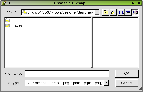 The Choose a Pixmap dialog is invoked by clicking the button next to the paletteBackgroundPixmap or the pixmap property in the property editor. It is also invoked by right-clicking the following widgets: PushButton, RadioButton, CheckBox, and ToolButton. In addition, this dialog can also be invoked by right-clicking the following widgets: Table, DataTable, ListBox, ComboBox, ListView, and IconView, and selecting Edit and then choosing the "Select a Pixmap" button.