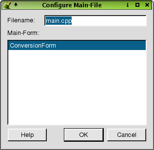 Click File|New|C++ Main-File to invoke the Configure Main-File dialog. Use this dialog to configure the main file and its forms.