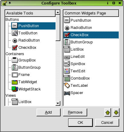 Click Tools|Configure Toolbox to invoke the Configure Toolbox Dialog. This dialog is used to view a list of available tools and a list of the tools in the Common Widgets category in the toolbox. To add widgets to the Common Widgets category, click a widget from the Available Widgets list and then click the Add. The selected widget now appears in the Common Widgets category. To remove a widget from the Common Widgets list, click a widget, then click Remove. To move a widget up or down in the Common Widgets list, click the up or down arrows.