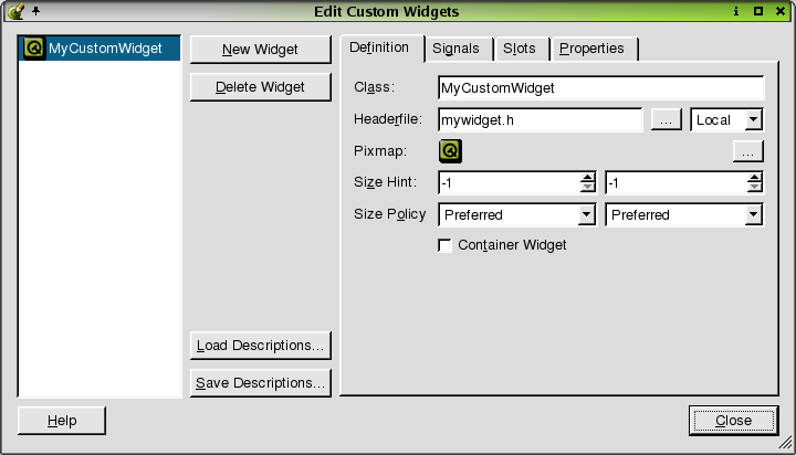 Click the Properties tab to view the list of properties for the selected widget. Click the 'Property' or 'Type' column headers to sort the properties in the listbox. To add a property, click the New Property button. Click the 'Property Name' line edit if you want to change the default name of the property. Note that properties must be implemented in the class using the property system of Qt. To choose a property type, click the 'Type' combobox. To delete a property from the listbox, click the property and then click the Delete Property button.
