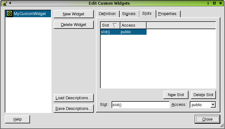 Click Edit|Slots to invoke the Edit Functions dialog. Use this dialog to edit or create slots and functions which are used in conjunction with signals to provide communication between objects.