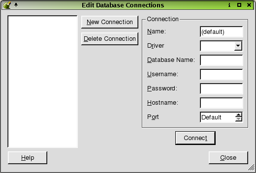 Click New Connection to create a new database connection. For applications that use a single database it will probably be most convenient to use the default connection name of '(default)'. If you use more than one database then each one must be given a unique name. A driver must be chosen from the Driver combo box. The database name may be available in the Database Name combo box or may have to be typed in. The database name, username, password and hostname should be provided by your database system administrator. When the Connection information has been completed click Connect. If the connection is made the connection name will appear in the list box on the left hand side of the dialog.