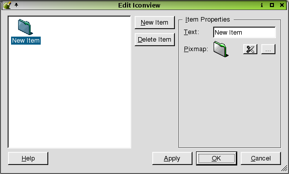 Use the dialog to add, change, or remove items from the iconview. To add an item to the iconview, click the New Item button. To change the name of the item, click the 'Text' line edit and type a new name. To add a pixmap, click the (ellipsis) button, which invokes the Choose an Image Dialog. To remove a pixmap, click the Delete Pixmap button. To delete an item from the iconview, click the item and then click the Delete Item button.