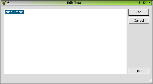 The Edit Text dialog is invoked by right-clicking the following widgets: PushButton, RadioButton, CheckBox, and ToolButton and selecting Edit Text.