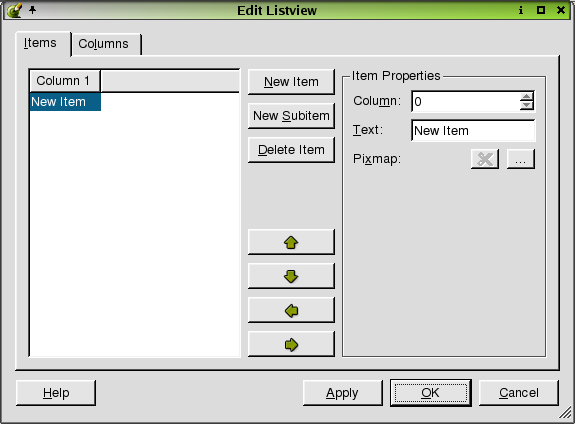 The dialog defaults to the Items tab. Use this tab to add, change, or remove items in the listview. To add a new item, click the New Item button. The new item is shown at the top of the listbox. To add sub-items to an existing item, click the item and then click the New Subitem button. Click the 'Column' spinbox to choose a column for which the item text or pixmap will be placed. Click the 'Text' line edit to type text for a column, or to change the name of an item or subitem. Click a pixmap and then click the Delete Pixmap button to delete the selected pixmap. To delete an item from the listbox, click the item and then click the Delete button. To move an item up or down within the hierarchy level, click the Move Up or Move Down buttons. To move an item up or down one level, click the Move Left or Move Right buttons.