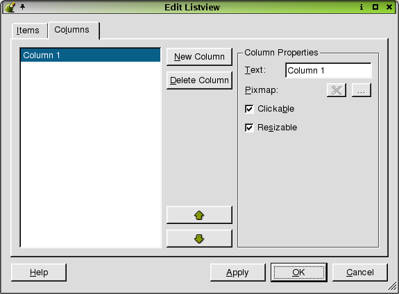 Click this tab to change the column configuration of the listview. To add a column, click the New Column button. The new column is shown at the top of the listbox. To change the column name, click a column in the listbox and then click the 'Text' line edit and type a new name. To add a pixmap, click the (ellipsis) button, which invokes the Choose an Image Dialog. To remove a pixmap, click the Delete Pixmap button. Click the 'Clickable' checkbox if you want the columns to respond to mouse clicks. Click the 'Resizeable' checkbox if you want to be able to change the column's width. To remove a column, click the column in the listbox and then click the Delete Column button. To move a column up or down in the listbox, click the Move Up or the Move Down buttons.