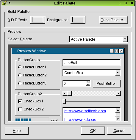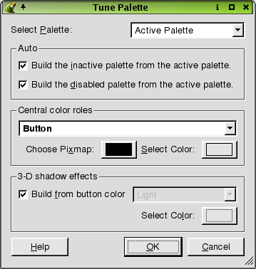 Click the 'Select Palette' combobox to choose options for active, inactive, or disabled palettes. If you choose 'Active Palette', the dialog presents three categories used for designing the palette. The categories are the Auto, Central Color Roles, and 3-D Shadow Effects. If you choose 'Inactive Palette' or 'Disabled Palette', all categories are disabled except 'Auto'. Click the 'Auto' section checkboxes to build the inactive or disabled palettes from the active palette. For an active palette, click the 'Central color roles' combobox to select a color role for the palette. Click the Choose Pixmap button to invoke the Choose a Pixmap Dialog. Click the Select Color button to invoke the Select Color Dialog. Check the 'Build from button color' checkbox in the '3-D shadow effects' section to allow 3-D effects colors to be calculated from the button color. Uncheck the checkbox to enable the 'Choose 3-D effect color role' combobox. Click the combobox to select a color role for the 3-D effects. Click the Select Color button to invoke the Select Color Dialog.