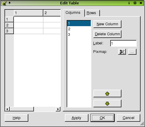 To add a column to the table, click the New Column button. To delete a column from the table, click the column you want to delete from the table, or click the column number in the 'Columns' listbox and then click the Delete Column button. To change a column name, click the 'Label' line edit and type the new text. To add a pixmap, click the (ellipsis) button, which invokes the Choose an Image Dialog. To remove a pixmap from the current column of the selected item, click the Delete Pixmap button. To move a column in the listbox, click the Move Up or Move Down buttons.