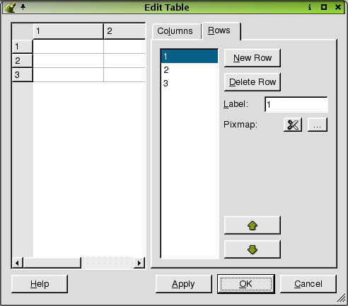 To add a row to the table, click the New Row button. To delete a row from the table, click the row you want to delete from the table, or click the row number in the 'Rows' listbox and then click the Delete Column button. To change a row's name, click the row, or the row number, and then click the 'Label' line edit and type the new text. To add a pixmap, click the (ellipsis) button, which invokes the Choose an Image Dialog. To remove a pixmap from the current row of the selected item, click the Delete Pixmap button. To move a row in the listbox, click the Move Up or Move Down buttons.