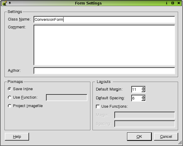 Click Edit|Form Settings to invoke the Form Settings dialog. Use this dialog to save the form's settings, pixmap, and layout properties.