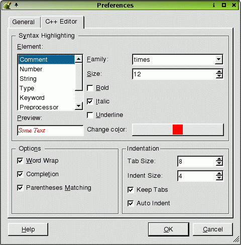 The C++ Editor tab provides options for customizing the editor. The 'Syntax Highlighting' section lets you change the way the syntax is viewed in the editor. Click the 'Element' listbox and choose an element. Click the 'Family' listbox to change the font style for that element. Click the 'Size' spinbox to choose a font size. You can change the font to Bold, Italic, or Underline by clicking the corresponding checkbox. Note, that all the fonts used derive from the 'Standard' element, so if you want to change the font used for everything, change the 'Standard' element. Click the Color button to invoke the Select Color Dialog. As you make changes to each element, you can view the changes in the 'Preview' line edit.