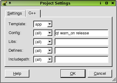 Click the C++ Tab to change the qmake options. See the qmake documentation for details on what these options mean. Click the 'Template' combobox and choose application or library to create makefiles for building applications or libraries. Click the 'Config' combobox to select the project configuration and compiler options for all platforms, or specific platforms. Type the Config value in the line edit. Note: Unix defaults to a shared library. If you want a shared library in Windows, type 'dll' at the end of the default config command and make sure you select lib from the Template combobox. Click the 'Libs' combobox to select a platform. Type the libraries in the line edit. Click the 'Defines' combobox and select a platform. 'Defines' values are added as compiler pre-processor macros. Type the 'Defines' values in the line edit. Click the 'Includepath' combobox to select a platform. Includepath specifies the directories that should be searched for include files when compiling the project. Type the 'Includepath' values in the line edit.