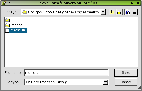 If you do not want Qt Designer to handle the images, (or are not using a project) choose either 'Save Inline' or 'Use Function'. 'Save Inline' saves the pixmaps in the .ui files. The disadvantage of this approach is that it stores images in the forms in which they're used, meaning that images cannot be shared across forms. Click 'Use Function' to use your own icon-loader function for loading pixmaps. Type the function's name (with no signature) in the 'Use Function' line edit. This function will be used in the generated code for loading pixmaps. Your function will be called with the text you put in the pixmap property (e.g. the image name) whenever an image is required.