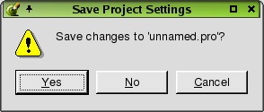The Save Project Settings message box is invoked by clicking File|Close or File|Exit for an open project with unsaved changes. The dialog displays the text 'Save changes to your project.pro'?. Click Yes to save the changes. If the project has any forms with unsaved changes, the Save Form As dialog is invoked when you click Yes. Click No to close the project without saving any changes. Click Cancel to leave the dialog without closing the project and without making any changes.