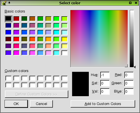 Choose a color from the 'Basic Colors' section and a sample of the color will appear in the small preview box at the bottom of the dialog. To the right of the color sample, you will see line edits that have information about the location of the color in the color spectrum. In addition, the crosshairs in the larger color spectrum window show the location of the color. You can also create a palette of custom colors. There are two ways to do add custom colors. Click a color on the color spectrum window. When the color appears in the small box below the window, click the color and drag it to one of the blank boxes in the 'Custom Color' section of the dialog. You can also click and drag colors from the 'Basic Colors' section. Another way to add colors is to click the Add to Custom Colors when you have chosen a color.