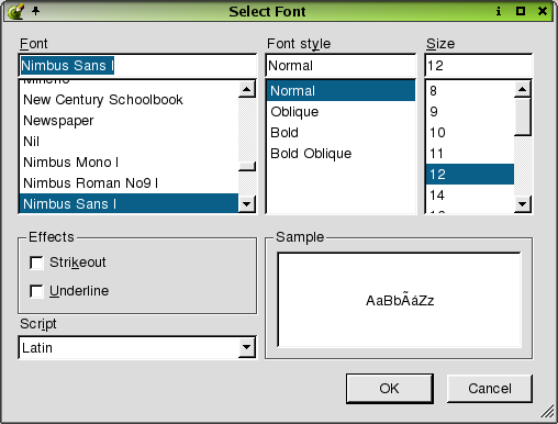 Click the 'Font' listbox to choose a font type. The current selected type appears in the line edit above the 'Font' listbox. Click the 'Font Style' listbox to choose a style for the font. The choices available in the listbox are limited to the type of font you choose. Not all fonts have all styles available. The selected style appears in the line edit above the 'Font Style' listbox. Click the 'Size' listbox to choose a size for the font. The current selected size appears in the line edit above the 'Size' line edit. Click the checkboxes in the 'Effects' section to create a 'Strikeout' or 'Underline' effect for the selected font. Click the 'Script' and choose a style of writing. View your font selections and styles in the 'Sample' listbox.
