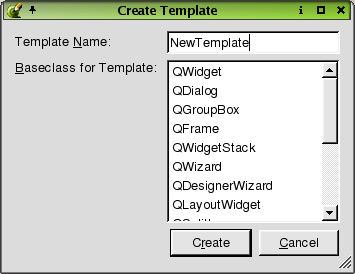 The 'Template Name' line edit defaults to 'New Template'. To change the name to a different name, type it in the line edit. Click the 'Baseclass for Template' scroll bar to choose a base class for the template.