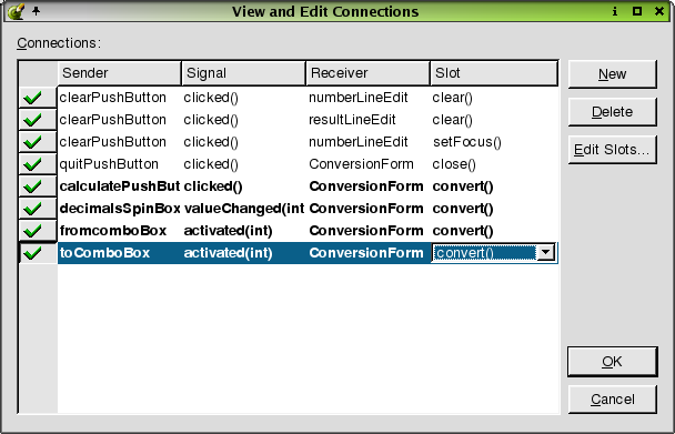 We need to connect three buttons: the Clear button, the Calculate button, and the Quit button. We also need to connect some of the other widgets. For convenience, we can make all of our connections at once using the View and Edit Connections dialog.