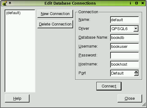 Choose Project|Database Connections from the menu bar. The Edit Database Connections dialog will appear. Click New Connection. For applications that use a single database it will probably be most convenient to use the default connection name of '(default)'. If you use more than one database then each one must be given a unique name. A driver must be chosen from the Driver combo box. The database name may be available in the Database Name combo box or may have to be typed in. The database name, username, password, hostname and port should be provided by your database system administrator. When the Connection information has been completed click Connect. If the connection is made the connection name will appear in the list box on the left hand side of the dialog. You can now close the dialog; the connection settings will remain in effect until you change or delete them or exit from Qt Designer.