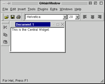 Below we present a QMainWindow which has a QMenuBar and some QToolBars that contain various widgets, e.g. QToolButtons and QComboBoxes. The central widget is a QWorkspace which is used for MDI window management and which contains an MDI-Window featuring a QTextEdit. At the bottom you see a QStatusBar and at the bottom-right a QSizeGrip.