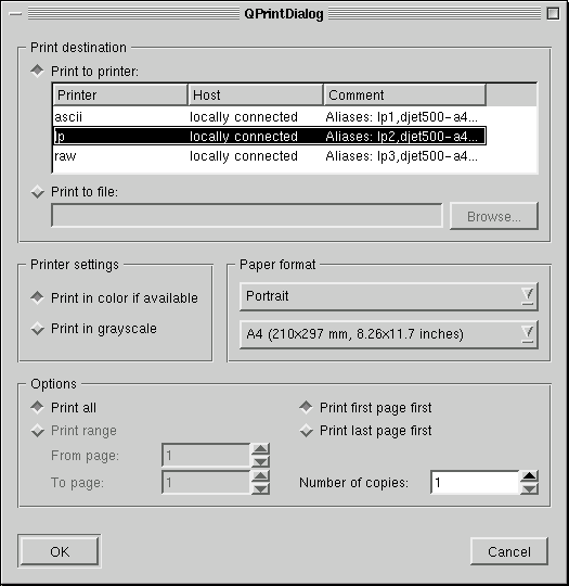 Below is a QPrintDialog. On Macintosh and Windows the native print dialog is used, but for other platforms we provide QPrintDialog. Use QPrinter::setup() for portability instead of the QPrintDialog if you need to be platform independent.