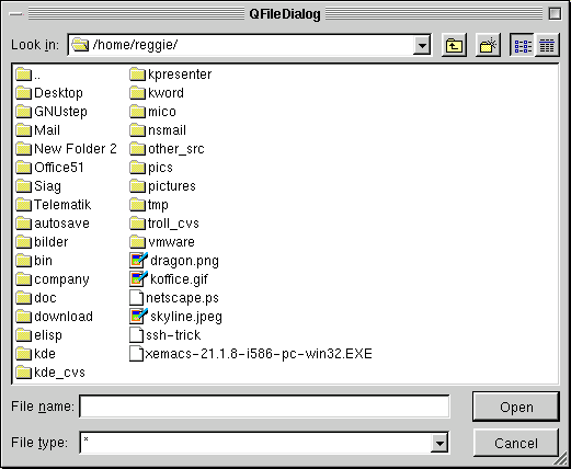 In the above example, a modal QFileDialog is created using a static function. The startup directory is set to "/home". The file filter is set to "Images (*.png *.xpm *.jpg)". The parent of the file dialog is set to this and it is given the identification name - "open file dialog". The caption at the top of file dialog is set to "Choose a file". If you want to use multiple filters, separate each one with two semi-colons, e.g.