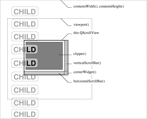 The QScrollView widget provides a scrolling area with on-demand scroll bars.