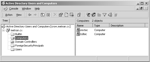 You can check your setup on Windows 2000 Advanced Server by opening the Start menu and selecting Programs, then Administrative Tools, then Active Directory Users and Computers. The window that opens up will look like Figure 4-17.