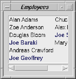 In addition, while the Tk listbox widget can only display text items, the TixTList widget can display a multitude of types of items: text, images and widgets. Also, while you can use only one font and one color in a listbox widget, you can use many different fonts and colors in a TixTList widget. In figure 3-1, we use graphical images inside a tixTList widget to represent file objects. In figure 3-2 , we display the names of all employees of a hypothetical company. Notice the use of a bold font to highlight all employees whose first name is Joe.