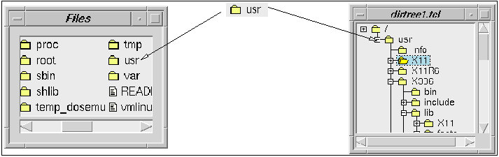We can better define the terms by taking a quick preview of the TixHList widget, which will be covered in details in the next chapter. Let's compare the items displayed on the two widgets in figure 3-3. If we take a close look at the item that shows the usr directory in the TixTList widget on the left versus the TixHList widget on the right, we can see that this item appears exactly the same on both widgets.