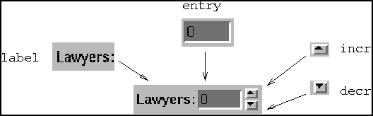 Each subwidget inside a mega is identified by a subwidget name. Naturally, the label and entry subwidgets inside a TixSelect widget are called label and entry, respectively. The two button widgets are called incr and decr because they are used to increment and decrement the value inside the TixControl widget (see figure 1-4).