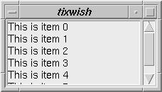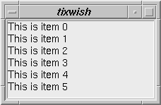 Also, as seen in the first line of program 2-7, we use the -scrollbar option to control the scrolling policy of the TixScrolledListBox widget. Usually, we'll set it to ``auto'': the scrollbars are displayed only if they are needed. Other possible values are ``both'': the two scrollbars are always displayed; ``x'': the horizontal scrollbar is always displayed, while the vertical scrollbar is always hidden; ``y'': the opposite of ``x''; ``none'': the two scrollbars are always hidden. The result of program 2-7 is shown in figure 2-8.